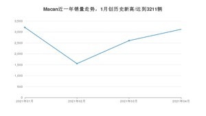 2021年4月,Macan销量为3125辆,同比下降16.8%,环比增长19.92%。1-4月份,Macan销量为10495辆,同比下降6.37%。在最近1年中,Macan销量在2021年01月达到最高,销量为3211辆。