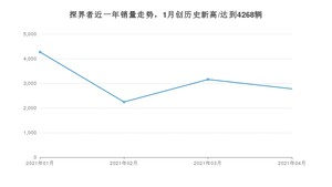 2021年4月,探界者销量为2776辆,同比下降18.4%,环比下降12.04%。1-4月份,探界者销量为12443辆,同比增长33.29%。在最近1年中,探界者销量在2021年01月达到最高,销量为4268辆。