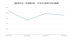 2021年4月,揽胜极光销量为1068辆,同比增长11.37%,环比下降8.09%。1-4月份,揽胜极光销量为4321辆,同比增长56.61%。在最近1年中,揽胜极光销量在2021年01月达到最高,销量为1289辆。