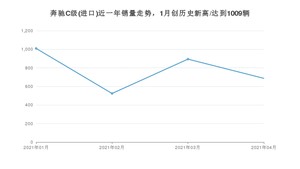 2021年4月,奔驰C级(进口)销量为687辆,同比下降11.13%,环比下降23.15%。1-4月份,奔驰C级(进口)销量为3114辆,同比增长35.45%。在最近1年中,奔驰C级(进口)销量在2021年01月达到最高,销量为1009辆。