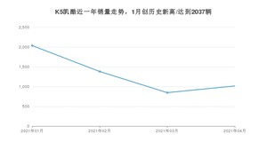 2021年4月,K5凯酷销量为1016辆,同比增长357.66%,环比增长19.95%。1-4月份,K5凯酷销量为5281辆,同比增长540.9%。在最近1年中,K5凯酷销量在2021年01月达到最高,销量为2037辆。
