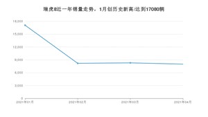 2021年4月,瑞虎8销量为8003辆,同比增长47.03%,环比下降3.47%。1-4月份,瑞虎8销量为41562辆,同比增长103.38%。在最近1年中,瑞虎8销量在2021年01月达到最高,销量为17080辆。