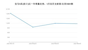 2021年4月,宝马5系(进口)销量为1170辆,同比下降5.49%,环比下降1.76%。1-4月份,宝马5系(进口)销量为5134辆,同比增长54.87%。在最近1年中,宝马5系(进口)销量在2021年01月达到最高,销量为1821辆。