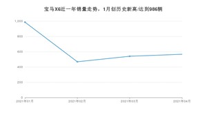 2021年4月,宝马X6销量为566辆,同比增长91.22%,环比增长4.81%。1-4月份,宝马X6销量为2560辆,同比增长222.82%。在最近1年中,宝马X6销量在2021年01月达到最高,销量为986辆。
