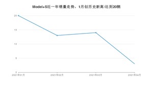 2021年4月,Model S销量为3辆,同比下降76.92%,环比下降78.57%。1-4月份,Model S销量为50辆,同比下降68.55%。在最近1年中,Model S销量在2021年01月达到最高,销量为20辆。