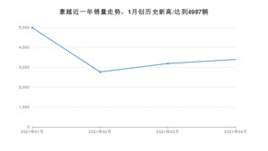 2021年4月,豪越销量为3393辆,环比增长6.4%。1-4月份,豪越销量为14332辆,在最近1年中,豪越销量在2021年01月达到最高,销量为4987辆。