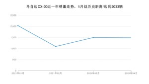 2021年4月,马自达CX-30销量为1483辆,同比增长14%,环比下降0.87%。1-4月份,马自达CX-30销量为6102辆,同比增长60%。在最近1年中,马自达CX-30销量在2021年01月达到最高,销量为2033辆。