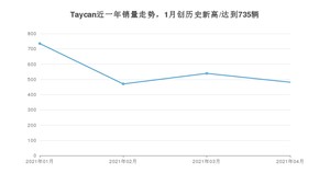 2021年4月,Taycan销量为481辆,同比增长1%,环比下降10.76%。1-4月份,Taycan销量为2225辆,同比增长4%。在最近1年中,Taycan销量在2021年01月达到最高,销量为735辆。