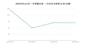2021年4月,ARCFOX αT销量为83辆,环比下降1.19%。1-4月份,ARCFOX αT销量为369辆,在最近1年中,ARCFOX αT销量在2021年01月达到最高,销量为143辆。