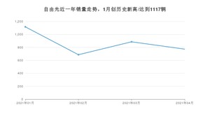 2021年4月,自由光销量为773辆,同比下降17.33%,环比下降12.75%。1-4月份,自由光销量为3463辆,同比增长8.22%。在最近1年中,自由光销量在2021年01月达到最高,销量为1117辆。