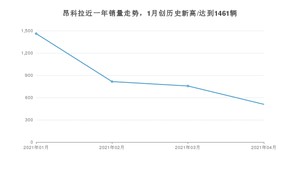 2021年4月,昂科拉销量为509辆,同比下降48.38%,环比下降32.67%。1-4月份,昂科拉销量为3541辆,同比增长12.02%。在最近1年中,昂科拉销量在2021年01月达到最高,销量为1461辆。