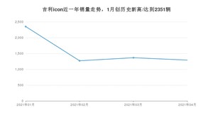 2021年4月,吉利icon销量为1290辆,同比下降51.76%,环比下降5.49%。1-4月份,吉利icon销量为6275辆,同比下降7.19%。在最近1年中,吉利icon销量在2021年01月达到最高,销量为2351辆。