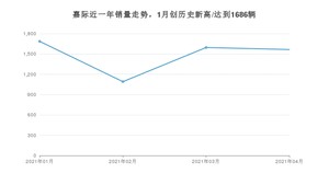 2021年4月,嘉际销量为1565辆,同比下降39.95%,环比下降1.88%。1-4月份,嘉际销量为5937辆,同比下降20.96%。在最近1年中,嘉际销量在2021年01月达到最高,销量为1686辆。