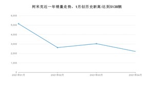 2021年4月,柯米克销量为2210辆,同比下降23.92%,环比下降27.06%。1-4月份,柯米克销量为12997辆,同比增长23.35%。在最近1年中,柯米克销量在2021年01月达到最高,销量为5138辆。