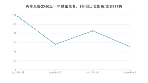 2021年4月,英菲尼迪QX60销量为51辆,同比下降63.83%,环比下降40%。1-4月份,英菲尼迪QX60销量为309辆,同比下降39.29%。在最近1年中,英菲尼迪QX60销量在2021年01月达到最高,销量为117辆。