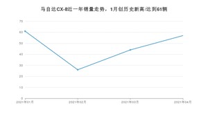 2021年4月,马自达CX-8销量为57辆,同比下降13.64%,环比增长29.55%。1-4月份,马自达CX-8销量为188辆,同比下降7.39%。在最近1年中,马自达CX-8销量在2021年01月达到最高,销量为61辆。