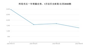 2021年4月,柯珞克销量为1289辆,同比下降18.57%,环比下降23.09%。1-4月份,柯珞克销量为7520辆,同比增长45.85%。在最近1年中,柯珞克销量在2021年01月达到最高,销量为2960辆。