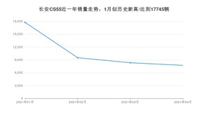 2021年4月,长安CS55销量为7707辆,同比增长20.48%,环比下降7.36%。1-4月份,长安CS55销量为43260辆,同比增长60.45%。在最近1年中,长安CS55销量在2021年01月达到最高,销量为17745辆。
