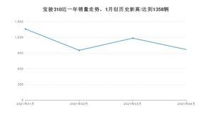 2021年4月,宝骏310销量为965辆,同比下降32.56%,环比下降18.5%。1-4月份,宝骏310销量为4459辆,同比增长1.11%。在最近1年中,宝骏310销量在2021年01月达到最高,销量为1358辆。