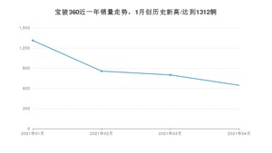 2021年4月,宝骏360销量为645辆,同比下降64.96%,环比下降19.27%。1-4月份,宝骏360销量为3612辆,同比下降60.96%。在最近1年中,宝骏360销量在2021年01月达到最高,销量为1312辆。