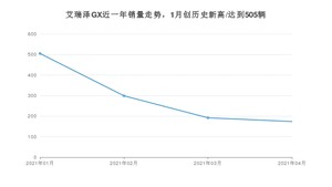 2021年4月,艾瑞泽GX销量为174辆,同比下降87.17%,环比下降9.38%。1-4月份,艾瑞泽GX销量为1170辆,同比下降78.75%。在最近1年中,艾瑞泽GX销量在2021年01月达到最高,销量为505辆。