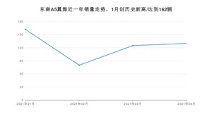 2021年4月,东南A5翼舞销量为130辆,同比下降49.02%,环比增长4%。1-4月份,东南A5翼舞销量为497辆,同比下降60.99%。在最近1年中,东南A5翼舞销量在2021年01月达到最高,销量为162辆。
