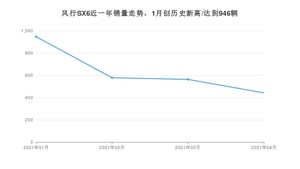 2021年4月,风行SX6销量为442辆,同比下降33.53%,环比下降21.49%。1-4月份,风行SX6销量为2529辆,同比下降5.07%。在最近1年中,风行SX6销量在2021年01月达到最高,销量为946辆。