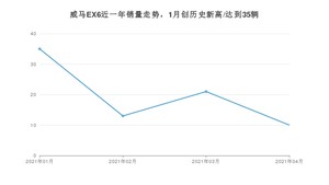 2021年4月,威马EX6销量为10辆,同比下降90.38%,环比下降52.38%。1-4月份,威马EX6销量为79辆,同比下降68.27%。在最近1年中,威马EX6销量在2021年01月达到最高,销量为35辆。