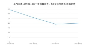 2021年4月,上汽大通 EUNIQ 6销量为20辆,环比增长5.26%。1-4月份,上汽大通 EUNIQ 6销量为99辆,在最近1年中,上汽大通 EUNIQ 6销量在2021年01月达到最高,销量为34辆。