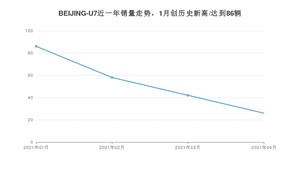 2021年4月,BEIJING-U7销量为26辆,同比下降94.26%,环比下降38.1%。1-4月份,BEIJING-U7销量为212辆,同比下降84.37%。在最近1年中,BEIJING-U7销量在2021年01月达到最高,销量为86辆。