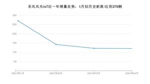 2021年4月,东风风光ix7销量为120辆,同比下降44.44%,环比下降0.83%。1-4月份,东风风光ix7销量为653辆,同比下降35.73%。在最近1年中,东风风光ix7销量在2021年01月达到最高,销量为270辆。