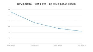 2021年4月,SWM斯威X3销量为218辆,同比下降26.85%,环比下降18.96%。1-4月份,SWM斯威X3销量为1407辆,同比增长58.98%。在最近1年中,SWM斯威X3销量在2021年01月达到最高,销量为554辆。