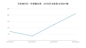 2021年4月,天际汽车品牌总体销量达到211辆,其中天际ME7销量达到211辆,占品牌总销量的100%。
