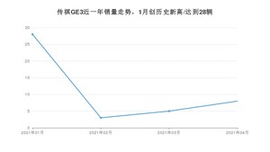 2021年4月,传祺GE3销量为8辆,同比下降92.31%,环比增长60%。1-4月份,传祺GE3销量为44辆,同比下降84.4%。在最近1年中,传祺GE3销量在2021年01月达到最高,销量为28辆。