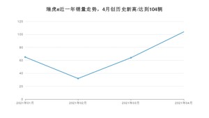 2021年4月,瑞虎e销量为104辆,同比下降22.96%,环比增长62.5%。1-4月份,瑞虎e销量为265辆,同比下降40.85%。在最近1年中,瑞虎e销量在2021年04月达到最高,销量为104辆。