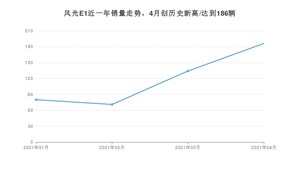 2021年4月,风光E1销量为186辆,同比增长9%,环比增长38.81%。1-4月份,风光E1销量为471辆,同比增长7%。在最近1年中,风光E1销量在2021年04月达到最高,销量为186辆。