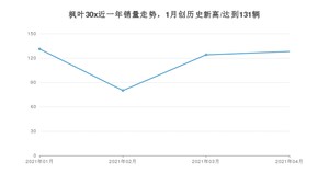 2021年4月,枫叶30x销量为128辆,同比增长814.29%,环比增长3.23%。1-4月份,枫叶30x销量为463辆,同比增长1%。在最近1年中,枫叶30x销量在2021年01月达到最高,销量为131辆。