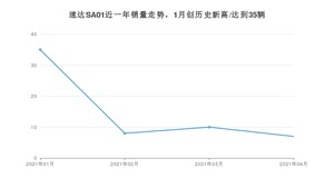 2021年4月,速达SA01销量为7辆,同比下降86.27%,环比下降30%。1-4月份,速达SA01销量为60辆,同比下降50%。在最近1年中,速达SA01销量在2021年01月达到最高,销量为35辆。