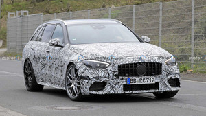日前,众车网从海外汽车媒体处获得了一组全新梅赛德斯-AMG C63旅行版车型的路试谍照,新车将放弃传统的V8发动机,转而采用综合输出功率更高的混合动力系统,全新C63系列车型有望于2022年正式发布。