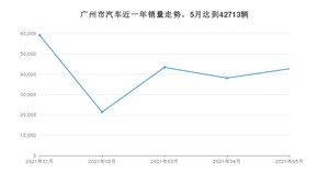 2021年5月,广州市汽车总销量为42713辆,同比增长12.41%,环比增长11.92%。1-5月份,广州市总销量为204895辆,同比增长53.42%。在最近1年中,广州市销量在2021年01月达到最高,销量为59192辆。
