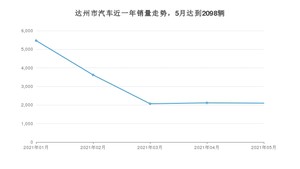 2021年5月,达州市汽车总销量为2098辆,同比下降10.34%,环比下降0.76%。1-5月份,达州市总销量为15365辆,同比增长26.2%。在最近1年中,达州市销量在2021年01月达到最高,销量为5466辆。