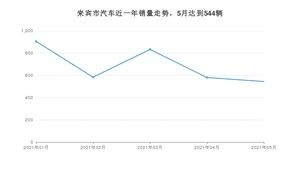 2021年5月,来宾市汽车总销量为544辆,同比下降22.84%,环比下降6.21%。1-5月份,来宾市总销量为3443辆,同比增长8%。在最近1年中,来宾市销量在2021年01月达到最高,销量为904辆。
