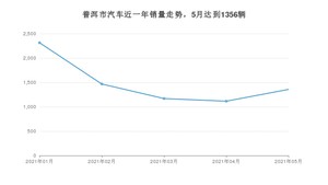 2021年5月,普洱市汽车总销量为1356辆,同比增长4.55%,环比增长21.61%。1-5月份,普洱市总销量为7421辆,同比增长26.27%。在最近1年中,普洱市销量在2021年01月达到最高,销量为2314辆。