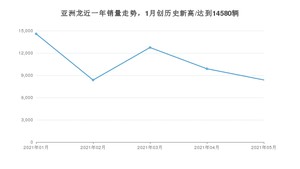 2021年5月,亚洲龙销量为8371辆,同比增长4.23%,环比下降15.25%。1-5月份,亚洲龙销量为53927辆,同比增长85.49%。在最近1年中,亚洲龙销量在2021年01月达到最高,销量为14580辆。