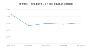 2021年5月,领克03销量为6080辆,同比下降5.01%,环比增长6.02%。1-5月份,领克03销量为31631辆,同比增长30.12%。在最近1年中,领克03销量在2021年01月达到最高,销量为8608辆。