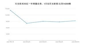 2021年5月,长安欧尚X5销量为9319辆,环比增长6.36%。1-5月份,长安欧尚X5销量为49467辆,在最近1年中,长安欧尚X5销量在2021年01月达到最高,销量为14254辆。