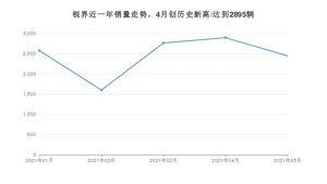 2021年5月,锐界销量为2446辆,同比增长1.66%,环比下降15.51%。1-5月份,锐界销量为12279辆,同比增长37.44%。在最近1年中,锐界销量在2021年04月达到最高,销量为2895辆。