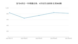 2021年5月,宝马4系销量为818辆,同比增长67.62%,环比下降2.85%。1-5月份,宝马4系销量为3888辆,同比增长67.3%。在最近1年中,宝马4系销量在2021年04月达到最高,销量为842辆。