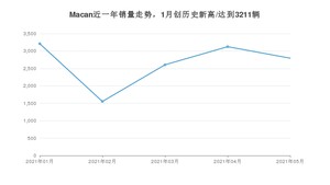 2021年5月,Macan销量为2795辆,同比下降23.51%,环比下降10.56%。1-5月份,Macan销量为13290辆,同比下降10.58%。在最近1年中,Macan销量在2021年01月达到最高,销量为3211辆。