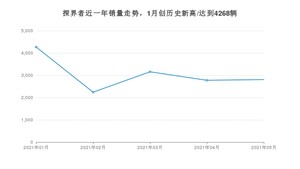 2021年5月,探界者销量为2807辆,同比下降22.16%,环比增长1.12%。1-5月份,探界者销量为15250辆,同比增长17.84%。在最近1年中,探界者销量在2021年01月达到最高,销量为4268辆。